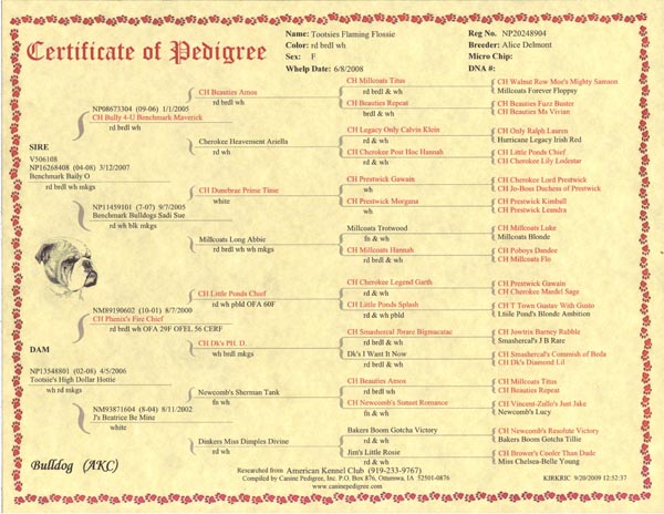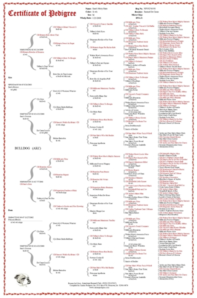 4 Generation Pedigree Pedigree is Researched from the registry your dog is registered with. Champions in red and the color, DNA / OFA information is displayed on all but the last generation. Order Online $14.00 More Info